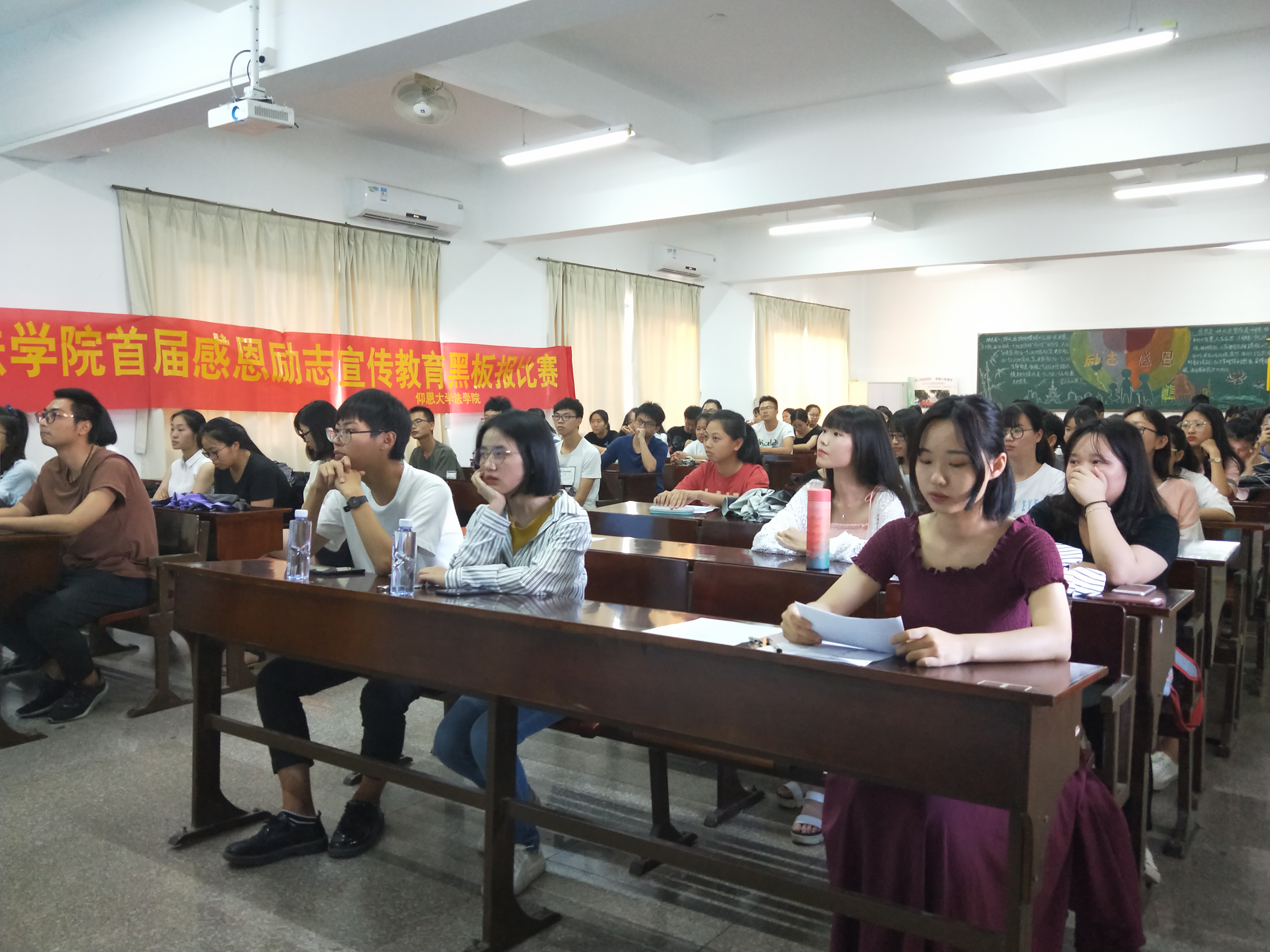为进一步丰富学生文化生活,展现beat365在线体育官网登录入口青年学生奋发向上的精神风貌。 5月25日,beat365在线体育官网登录入口在普照楼202室举行首届感恩励志黑板报评比颁奖暨感恩励志教育大会。beat365在线体育官网登录入口党总支副书记黄伟斌,学务秘书汪明,学生干部代表等参加了此次活动。