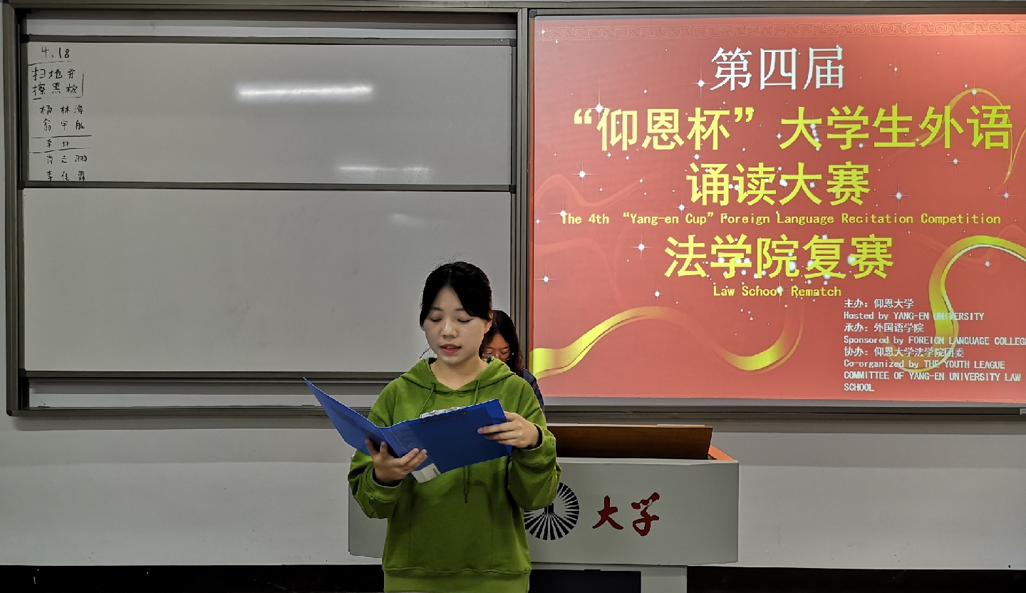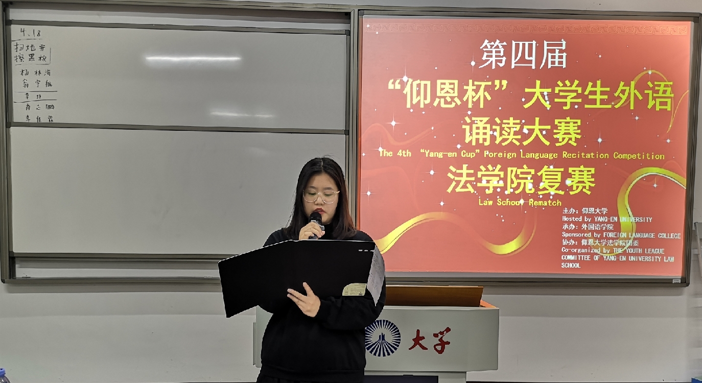 4月18日晚,由仰恩大学主办,外国语学院承办,beat365在线体育官网登录入口团委协办的第四届“仰恩杯”大学生外语诵读大赛beat365在线体育官网登录入口复赛于仰恩大学第三教学区普照楼204举行。外国语学院老师陈苗苗,梁正长担任本次比赛评委,beat365在线体育官网登录入口17级、18级学生参加了此次活动。