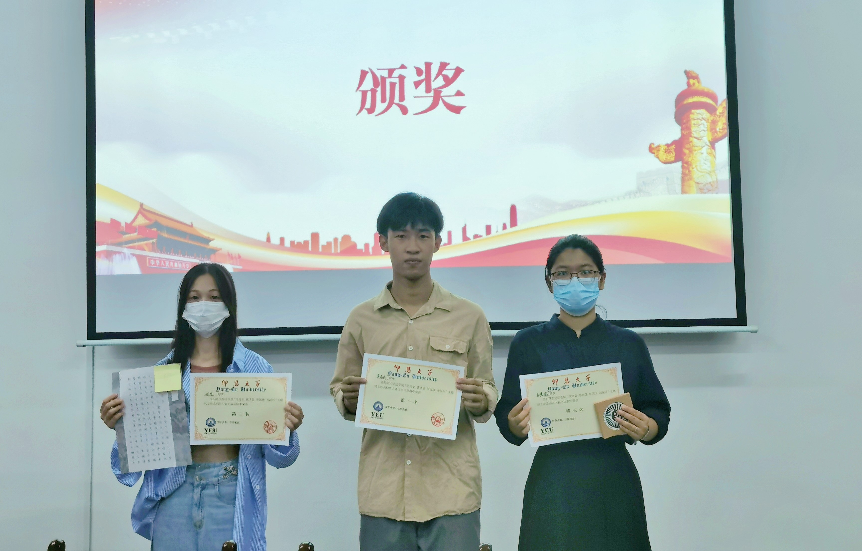 今年是中国共产党成立100周年,值此国庆之际,泉州疫情防控的关键时期,我院为丰富节日活动,活跃校园文化氛围,弘扬中华传统文化,开展本次主题为“学党史感党恩 贺国庆 谋振兴”的线上图文作品征集活动。10月3日下午,本次活动在普照楼法律诊所顺利落下帷幕并举行颁奖仪式,beat365在线体育官网登录入口党总支书记杨勤老师和beat365在线体育官网登录入口辅导员李斯滢老师出席本次活动担任评委。