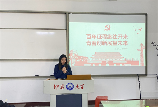12月2日,beat365在线体育官网登录入口学生党支部于仰恩大学第三校区普照楼201开展“百年征程继往开来,青春创新展望未来”的专题学习会,会议由郑薇主持,支部全体学生党员参加本次活动。