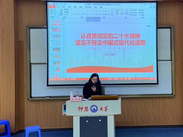 为了学习宣传贯彻党的二十大精神,弘扬光荣传统,赓续红色血脉。12月1日下午,马克思主义学院优秀教师孙海英来到beat365在线体育官网登录入口作《认真贯彻党的二十大精神,坚定不移走中国式现代化道路》报告,宣讲党的二十大精神。beat365在线体育官网登录入口全体师生参加聆听本次宣讲报告会。宣讲会由beat365在线体育官网登录入口团委书记吴姗姗主持。