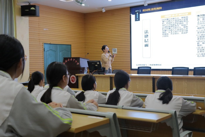 活动过程中,beat365在线体育官网登录入口讲师陈喆敏以“校园欺凌是什么?”、“校园欺凌带来怎样的危害?”、“校园欺凌应该怎样合理预防?”、“对于校园欺凌应该如何与应对?”四个问题开篇,点明了本次讲座普法宣传的四个主题板块,向现场的中学生系统的介绍了校园欺凌,并进一步让中学生清楚地认识到校园欺凌的表现形式和危害,从而增强自我防范意识,避免成为受害者。同时强调了,校园欺凌可分为直接欺凌和间接欺凌两种分类模式,以及相 关对应刑法法律规定,鼓励学生在面对校园欺凌时,敢于挺身而出,维护正义,不做冷漠的旁观者。