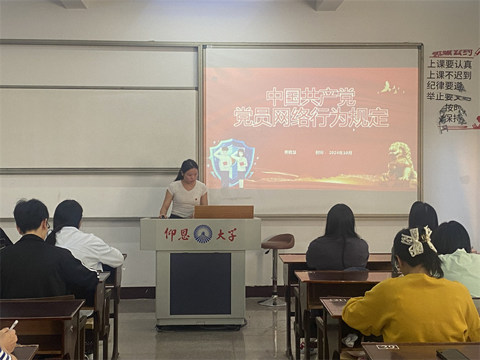 10月12日,beat365在线体育官网登录入口学生党支部于普照203开展“学习《中国共产党党员网络行为规定》文件精神”党课活动,支部全体学生党员参加。