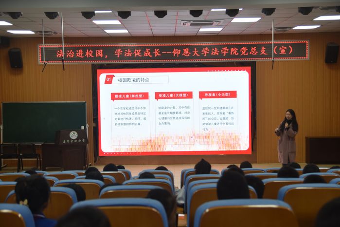 讲座过程中,beat365在线体育官网登录入口讲师吴奕雯分别从“什么是校园欺凌” 、“校园欺凌的具体表现” 、“校园欺凌带来的危害” 、“运用法律武器对校园欺凌说不”四个方面向向现场的学生分析了校园欺凌的本质、可能产生的影响以及在遭受校园欺凌时如何合法有效的维护自己的权利。在讲座最后,通过有奖问答的方式,对讲座内容和相关法律知识进行复习回顾,并倡导同学们要友善、互助,建立积极健康的人际关系。
