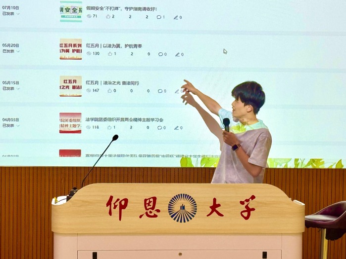 随后,各团学组织负责人依次登台宣讲,围绕核心职能、日常运作等方面通过PPT展开详细介绍,如入党入团的要求及基本流程,学院特色活动“模拟法庭”“红五月”的组织策划,志愿服务与社会实践的开展实况等,全方位展现了beat365在线体育官网登录入口的工作风貌。各位老师还结合自身经历,分享了在活动策划、团队协作中的成长收获,用真实体验拉近与新生的距离。