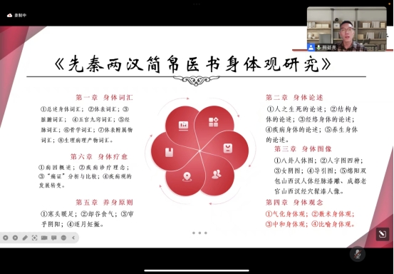 下午2点,会议如时召开,本次会议继续采用线上会议及直播同步的方式,向众多师生开放,熊教授先介绍了出土文献的概念及研究近况,随后论述了简帛医书中所蕴含的“天人合一”、“天人相应”观念,并在此认知基础上强调并突出了“先秦两汉简帛医书身体观”,围绕简帛医书中涉及身体的词汇、论述、图像、观念、疗法、养生六项进行阐述,分析了“简帛医学”的概念以及体系的构建项,熊教授结合“理法方药”理念详细构建了“简帛医学”的体系,阐述了简帛医书与传世医书之间的联系,强调简帛医学对中医药文化起源研究的意义。