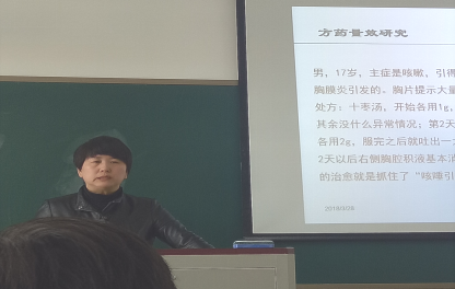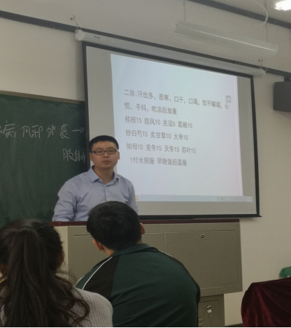 之后熊丽辉老师结合临床讲授了感冒的诊治。其中风温感冒主要用银翘散加减,银翘散的使用指征为发热、咽痛、舌红、脉数,若伴有高热,可加石膏、地骨皮,热退则减,咳嗽可加芦根至50g,并佐以枇杷叶、贝母,若遇患者有痰则加竹茹、瓜蒌。表寒里热主要用大青龙汤,其用药指征是寒战高热,而对于气虚多汗的表虚患者,则可用桂枝汤加减治疗。通过对临床常见病感冒系统的讲解,熊老师讲辨证论治的思想渗透在课程中,使学生在今后的学习中逐步形成“整体思维、辨证论治”的理念。