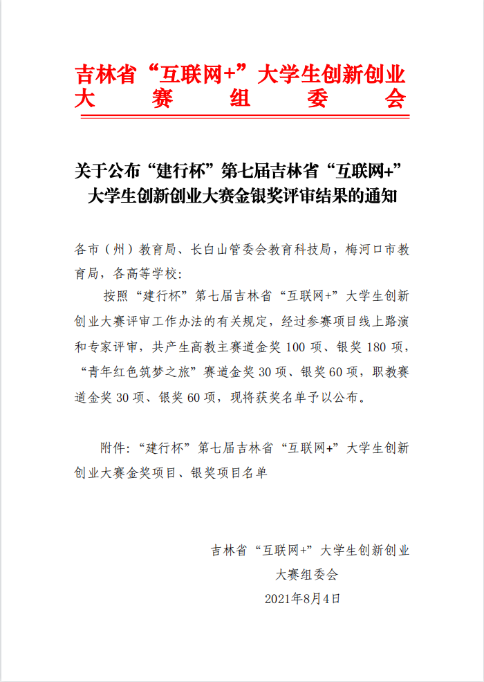 关于公布“建行杯”第七届吉林省“互联网+”大学生创新创业大赛金银奖评审结果通知